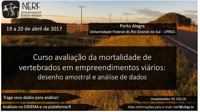 Curso de avaliação e mortalidade de vertebrados do Núcleo de Ecologia de Rodovias e Ferrovias (https://www.ufrgs.br/nerf/ind ex.php/10-noticias/76-abertas- inscricoes-curso-nerf)